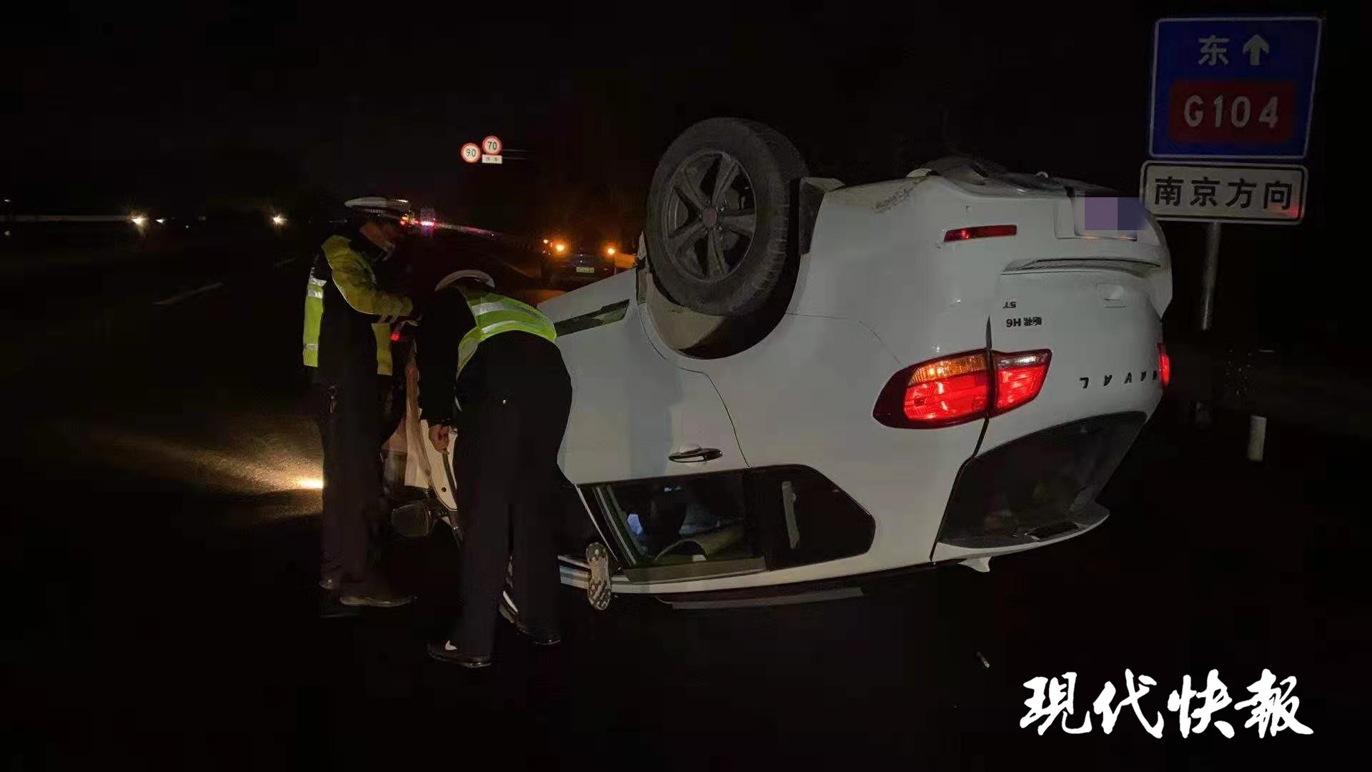 當(dāng)晚20時(shí)40分許,在徐州睢寧104國(guó)道京福線與朱官路路口發(fā)生驚險(xiǎn)一幕,56歲的男子尤某某駕駛小轎車行駛至該路口時(shí),因疲勞駕駛,車輛毫無(wú)減速地徑直撞向路邊大標(biāo)識(shí)牌,隨后,被撞飛的車輛四輪朝天翻倒在路中央,尤某某被困于車中無(wú)法脫身,于是撥打110報(bào)警求救。