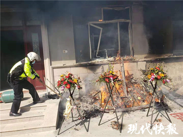 處警人員見(jiàn)情勢(shì)危急,立即拿起周圍一切可用的工具進(jìn)行滅火。有民警找來(lái)拖把奮力拍打火焰,輔警則找來(lái)垃圾桶接水滅火。