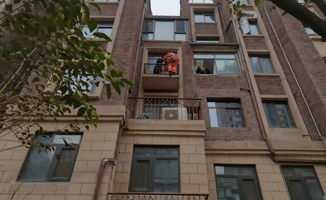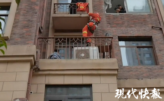 消防員趕到現(xiàn)場看到,3樓平臺上的男孩正坐在里面玩耍。因3樓住戶家中沒人,房門無法打開,消防員擔心孩子有可能再次出現(xiàn)翻越行為,于是立即利用繩索做好防護措施,從4樓男孩家降落至3樓小平臺,確認小孩并未受傷。
