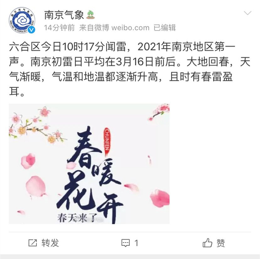 (記者 徐紅艷)3月15日10時(shí)17分,六合地區(qū)響起雷聲,這也是2021年南京地區(qū)第一聲。現(xiàn)代快報(bào)記者了解到,南京初雷日平均在3月16日前后。