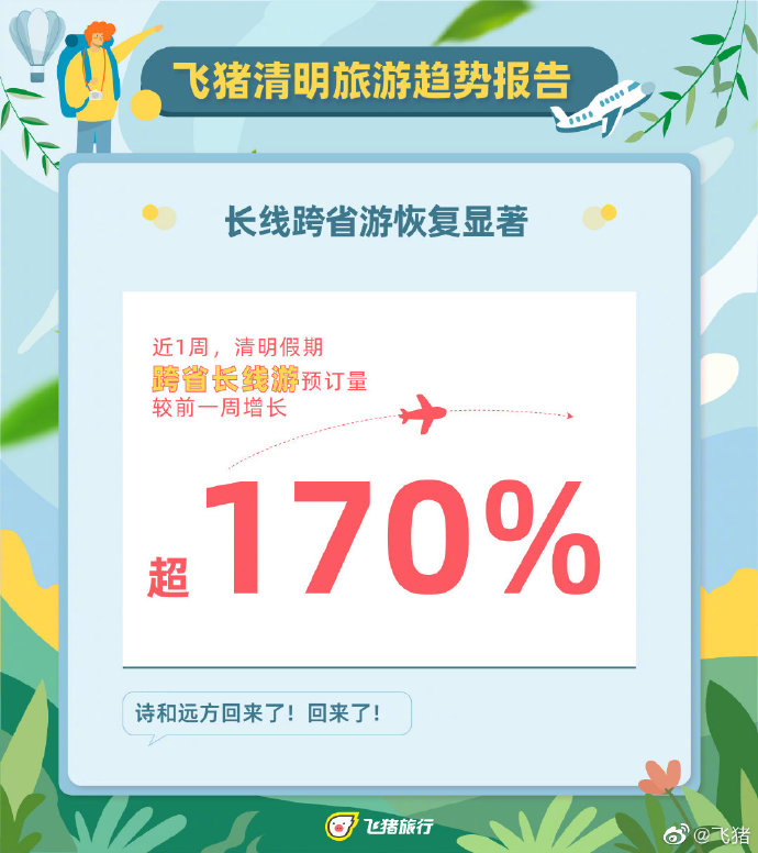現(xiàn)代快報(bào)記者從飛豬旅行了解到,近一周,清明機(jī)票預(yù)訂量比上一周增長(zhǎng)了150%,鄉(xiāng)村民宿預(yù)訂量較上周增長(zhǎng)超165%,跨省長(zhǎng)線游預(yù)訂量較上周增長(zhǎng)超170%,北上廣等位列清明熱門(mén)入住城市全國(guó)前十。