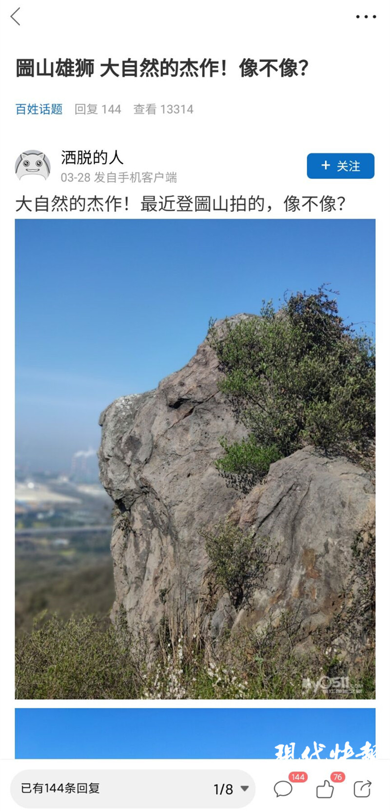 3月28日,網(wǎng)友“灑脫的人”拍下一張圌山雄獅照上傳鎮(zhèn)江本地論壇,不到24小時,點擊量即過萬,留言百余條。照片上,湛藍的天空下,“獅子”眉眼分明,眼睛、嘴巴緊閉,鼻頭處還有少許白色,巖石上長出的野草則好似“鬃毛”。網(wǎng)友們紛紛驚呼:太像了!有網(wǎng)友稱像一頭“剛剛睡醒的獅子”,有網(wǎng)友稱像“雄獅在閉目養(yǎng)神,蓄勢待發(fā)。”也有網(wǎng)友俏皮發(fā)問:“想到了《獅子王》,辛巴,是你嗎?”