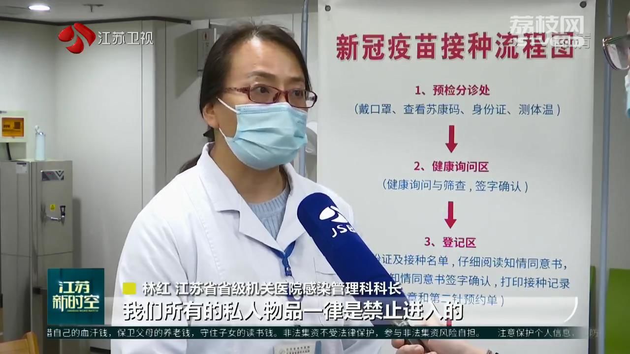 江蘇省省級(jí)機(jī)關(guān)醫(yī)院感染管理科科長(zhǎng)林紅告訴記者,從事疫苗接種的醫(yī)護(hù)人員都是二級(jí)防護(hù),戴一次性帽子,戴外科口罩,穿隔離衣,并且在接種區(qū)域里面所有的私人物品一律是禁止進(jìn)入的。