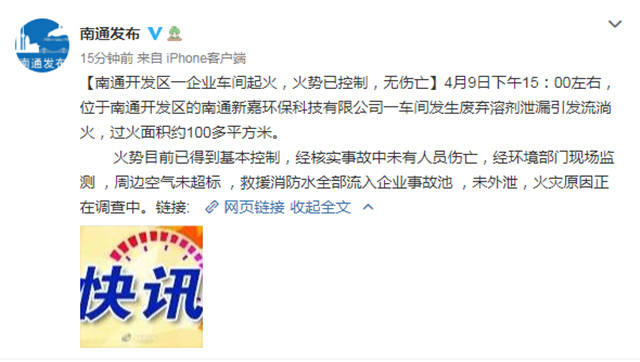 (記者 嚴(yán)君臣)4月9日下午,南通開發(fā)區(qū)一家企業(yè)突發(fā)火情,現(xiàn)場火勢較大,濃煙滾滾,引發(fā)不少網(wǎng)友關(guān)注。隨后,南通市委宣傳部官方微博“南通發(fā)布”發(fā)布通報,當(dāng)日下午15:00左右,位于南通開發(fā)區(qū)的南通新嘉環(huán)??萍加邢薰疽卉囬g發(fā)生廢棄溶劑泄漏引發(fā)流淌火,過火面積約100多平方米。