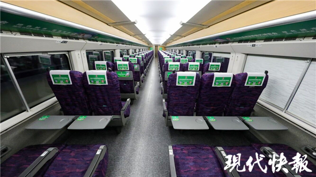 走進(jìn)“世園號”車廂,隨處可見代表著世園會的綠色:靠背、桌板、行李架,都布滿了世園會的景點(diǎn)圖案,畫面中,吉祥物“康康”“樂樂”也張開著雙手,迎接八方賓朋。