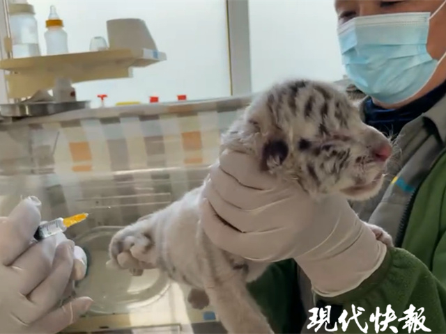 據(jù)南通森林野生動(dòng)物園工作人員介紹,四只小白虎在園內(nèi)出生,因?yàn)榘谆寢尩谝淮紊a(chǎn),沒(méi)有哺育經(jīng)驗(yàn),四個(gè)小兄弟就被媽媽“遺棄”。工作人員把四兄弟送往育幼室,進(jìn)行人工育幼。本次疫苗接種是為了預(yù)防小白虎剛出生時(shí)抵抗力差,外界可能會(huì)給它們帶來(lái)的炎癥。