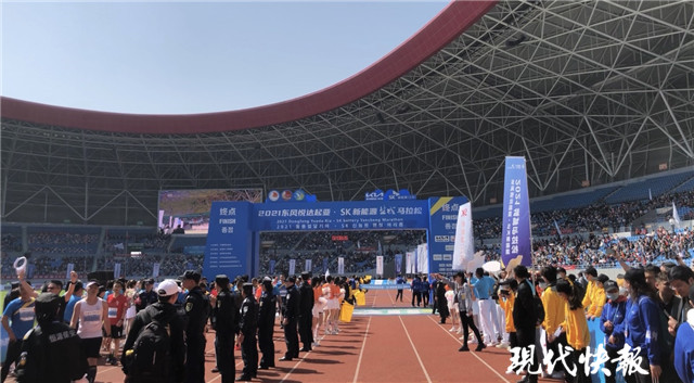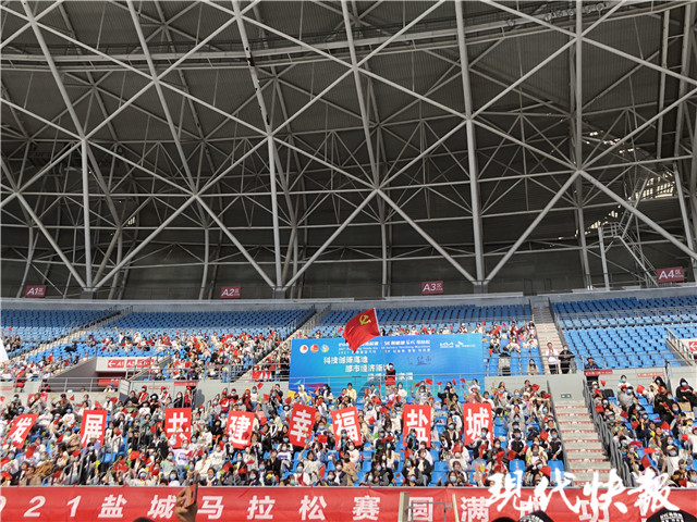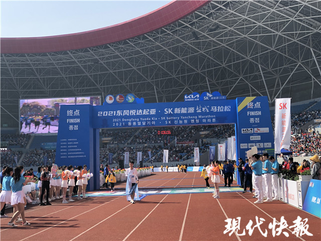 “半程馬拉松第一名即將抵達終點,請在場的觀眾一起為他加油吶喊!”在終點——鹽南體育中心體育場,隨著主持人對賽況的持續(xù)播報,現(xiàn)場的觀眾歡呼著迎接半馬第一名沖線。