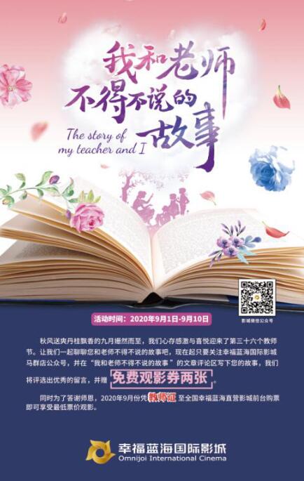 秋風(fēng)送爽丹桂飄香的九月姍然而至,我們心存感激與喜悅迎來(lái)了第三十六個(gè)教師節(jié)。讓我們一起聊聊您和老師不得不說(shuō)的故事吧,現(xiàn)在起只要關(guān)注幸福藍(lán)海國(guó)際影城馬群店公眾號(hào),并在“我和老師不得不說(shuō)的故事 ”的文章評(píng)論區(qū)寫下您的故事,我們將評(píng)選出優(yōu)秀的留言,并贈(zèng)免費(fèi)觀影券兩張。