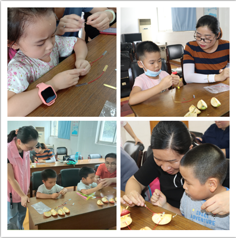 活動開始之前,社區(qū)巾幗志愿者將大家?guī)淼奶O果逐個切片作為實驗材料。在等待活動開始的同時,志愿者們還為每位孩子準備了可愛的竹蜻蜓,鼓勵小朋友們認真聽講,積極參與。