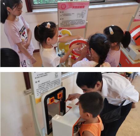 現(xiàn)場,孩子們在南京科技館工作人員的指導(dǎo)下,開啟一場神奇有趣的科技之旅。按下啟動按鈕,一道道電弧從儀器底端不斷向上爬升,仿佛神話中的雅各布天鵝;用手在無皮鼓的兩面做敲擊動作,會發(fā)出“咚咚”的聲音??破沾笈褴嚿弦幌盗械能囕d展品讓孩子們大開眼界,大家滿載好奇心圍住展品體驗起來。在互動體驗的同時,孩子們還不忘詢問起旁邊的新時代文明實踐志愿者們這些神奇現(xiàn)象背后的原理,志愿者的科普聲交織著孩子們游完的歡笑聲,整個現(xiàn)場其樂融融。