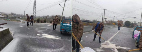 受降雪天氣影響,西埠村道路出現(xiàn)積雪濕滑現(xiàn)象,給道路交通安全帶來隱患。南京市江寧區(qū)淳化街道西埠村志愿者、網格員、民兵聯(lián)動,對積雪結冰路段開展撒鹽融冰除雪工作,將降雪天氣對道路交通的影響降到最低,為人民群眾的安全出行提供有力的保障。