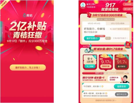 9月3日-9月16日,每人/每天有2次抽獎(jiǎng)機(jī)會(huì),無需騎行,進(jìn)入活動(dòng)頁面自動(dòng)獲得,可直接抽取。用戶通過抽獎(jiǎng)有幾率獲得917元現(xiàn)金、91.7元現(xiàn)金、9.17元現(xiàn)金、騎行折扣券和成長值等約50種隨機(jī)獎(jiǎng)勵(lì),均為限量,先到先得。同時(shí),用戶可以邀請(qǐng)好友共同助力成長值,在9月17通過騎行,瓜分300萬現(xiàn)金。