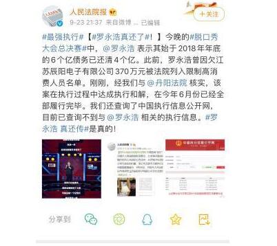 此話一出,立即引起了網(wǎng)友們的熱議。9 月 23 日晚 9:37,人民法院報官微 "@人民法院報 " 發(fā)布微博,為羅永浩 " 正名 "。人民法院報稱," 此前,羅永浩曾因欠江蘇辰陽電子有限公司 370 萬元被法院列入限制高消費人員名單。經(jīng)與江蘇省丹陽人民法院核實,該案在執(zhí)行過程中達(dá)成執(zhí)行和解,在今年 6 月份已經(jīng)全部履行完畢。"9 月 24 日凌晨 1:28,羅永浩轉(zhuǎn)發(fā)了人民法院報的這條微博,并評論道 " 慚愧,感謝。"