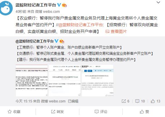 工商銀行、交通銀行、農(nóng)業(yè)銀行、建設(shè)銀行、招商銀行等集體發(fā)布公告,宣布暫停個(gè)人貴金屬交易開戶。