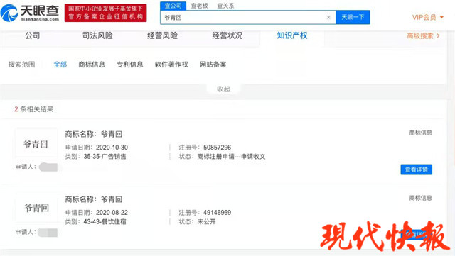 △ 天眼查查詢發(fā)現“爺青回”已被申請注冊商標,網絡截圖