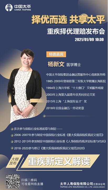 為充分貫徹以客戶為中心的服務(wù)理念,太平人壽江蘇分公司將于2021年1月9日召開重疾新政解讀暨擇優(yōu)理賠發(fā)布會(huì),本次發(fā)布會(huì)特邀2007版《重大疾病保險(xiǎn)疾病定義規(guī)范》、2013年中國保險(xiǎn)行業(yè)標(biāo)準(zhǔn)《人身保險(xiǎn)傷殘?jiān)u定標(biāo)準(zhǔn)與代碼》、《重大疾病保險(xiǎn)疾病定義規(guī)范2020》修訂專家委員會(huì)成員,中國太平保險(xiǎn)集團(tuán)金融運(yùn)營服務(wù)中心首席醫(yī)務(wù)師——醫(yī)學(xué)博士楊新文博士,對(duì)新政進(jìn)行權(quán)威解讀,旨在讓更多的客戶了解重疾新政的變化及太平人壽相應(yīng)的舉措。
