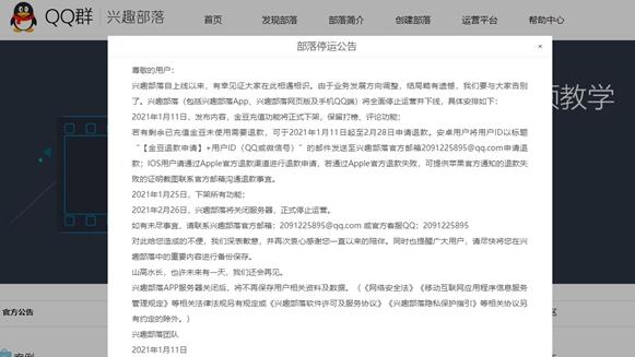 1月11日,騰訊QQ群興趣部落發(fā)布“部落停運公告”,包括興趣部落App、興趣部落網(wǎng)頁版及手機QQ端在內(nèi)的興趣部落將全面停止運營并下線。