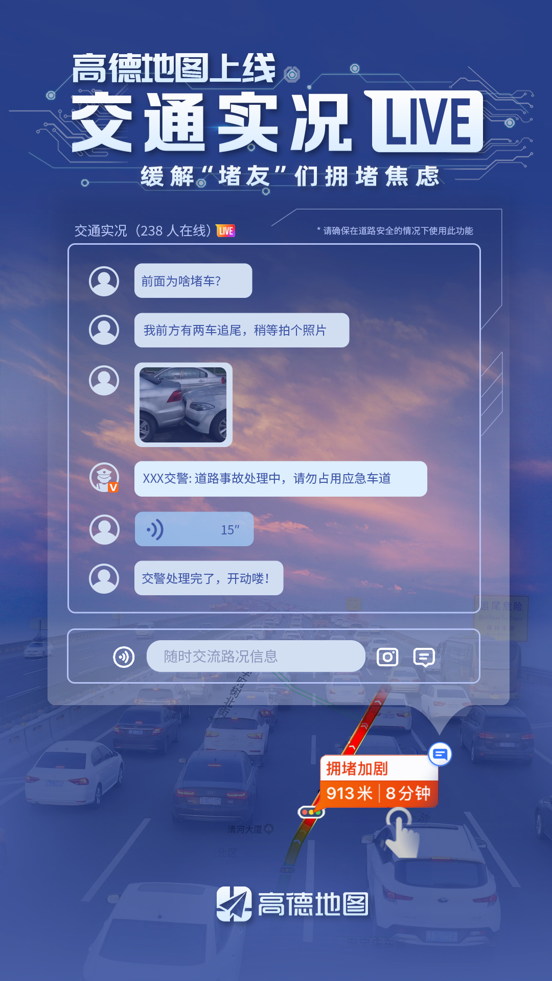 此次高德地圖通過(guò)與各地交警部門建立合作,并根據(jù)交通大數(shù)據(jù)對(duì)擁堵路段的精準(zhǔn)研判,推出“交通實(shí)況”服務(wù),就是基于嚴(yán)重?fù)矶侣范蝿?chuàng)建的信息發(fā)布和分享平臺(tái)。通過(guò)這個(gè)平臺(tái),各地交管部門可及時(shí)發(fā)布擁堵事件的權(quán)威信息,如擁堵原因、派警情況、預(yù)計(jì)疏通用時(shí)及現(xiàn)場(chǎng)圖片等。當(dāng)用戶進(jìn)入嚴(yán)重?fù)矶侣范螘r(shí),通過(guò)點(diǎn)擊提醒氣泡即可進(jìn)入該界面,實(shí)時(shí)了解擁堵信息。在車輛因堵車無(wú)法行進(jìn)時(shí),“堵友”們還可以互通有無(wú),通過(guò)文字、語(yǔ)音、圖片等多種方式,為后方司機(jī)分享第一手信息。而當(dāng)擁堵疏散時(shí),“交通實(shí)況”功能也將自動(dòng)關(guān)閉。