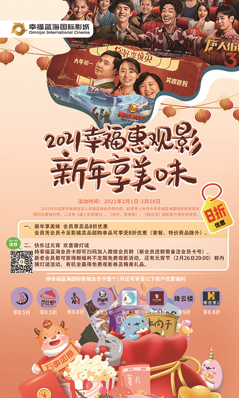 2021年歡迎更多新朋友加入幸福藍海會員俱樂部,趕緊帶上會員卡來幸福藍海國際影城享受豐厚的優(yōu)惠福利吧。二月有《唐人街探案3》、《你好,李煥英》、《熊出沒》精彩影片等您來觀賞。