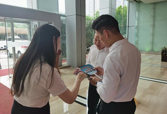 為更好地普及防非知識及《條例》內(nèi)容,太平人壽江蘇分公司于6月25日在置地廣場辦公樓一樓大廳開展集中宣傳活動。制作了以“學(xué)法用法護小家·防非處非靠大家”、“《防范和處置非法集資條例》于5月1日起正式施行”等主題展板,營造濃厚的宣傳氛圍。此外,還制作了防非知識三折頁以及防非口號宣傳扇,宣傳扇上印制“學(xué)法用法護小家,防非處非靠大家、保險助力保民生,欺詐騙保必嚴懲、防范洗錢嚴守法,金融安全你我他”宣傳口號,在炎炎夏日讓金融知識給大家?guī)硪魂嚽屣L(fēng)。本次共計發(fā)放宣傳扇及防非三折頁170余份,現(xiàn)場還提供金融知識咨詢服務(wù),參與活動人員可以與工作人員交流自己對金融和保險方面的疑惑。