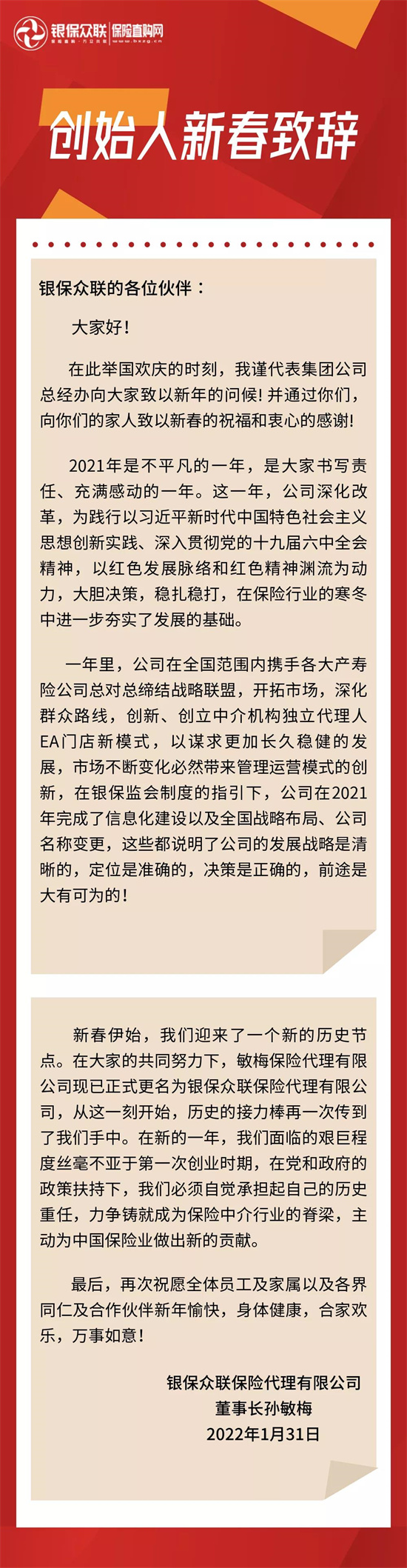 除夕將至,銀保眾聯(lián)保險代理有限公司創(chuàng)始人孫敏梅向全體員工及家屬、各局領(lǐng)導(dǎo)、各界同仁以及合作伙伴致以新春祝福!