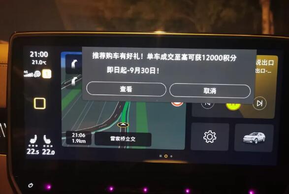 9月23日,重慶的劉女士駕駛剛買不久的一汽大眾ID.6Crozz純電車,在使用車載導(dǎo)航進行導(dǎo)航時,顯示導(dǎo)航信息的中控屏幕突然出現(xiàn)彈窗廣告,遮擋了行駛中的導(dǎo)航信息。9月24日,王女士告訴上游新聞記者:“第一次在行駛的汽車的中控屏上看到彈出的廣告,活久見,不喜歡有這樣的彈窗。”上游新聞記者從劉女士展示的圖片看到,中控觸摸屏顯示,車載4G網(wǎng)絡(luò)信號滿格,車輛正途徑一座立交橋,彈窗廣告面積幾乎占了觸摸屏的一半,駕駛員正在使用的導(dǎo)航行駛信息幾乎完全被遮擋。彈窗廣告上寫著“推薦購車有好禮!單車成交至高可獲12000積分 即日起-9月30日!”從內(nèi)容上看,劉女士告訴記者:“這個彈窗廣告應(yīng)該是廠家推送的,因為積分是大眾的,而不是4S店的。”